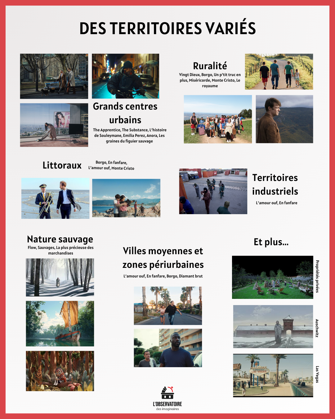 Les zones urbaines ne prennent pas toutes le même visage non plus : de grandes villes comme le Manhattan de The Apprentice, Las Vegas dans Anora, Paris pour L’histoire de Souleymane, Teheran pour Les graines du figuier sauvage ou Los Angeles dans The Substance. L'amour ouf et En fanfare dépeignent les territoires industriels du nord de la France, tandis que des films comme Diamant Brut ou Borgo se déroulent, entre autre, dans des villes moyennes (Fréjus, Ajaccio). On croise également des territoires comme le désert mexicain ou iranien, des propriétés privées qui servent de lieu à l'action, ou des territoires inclassables comme le camp de concentration d'Auschwitz, dans les environs de Cracovie.