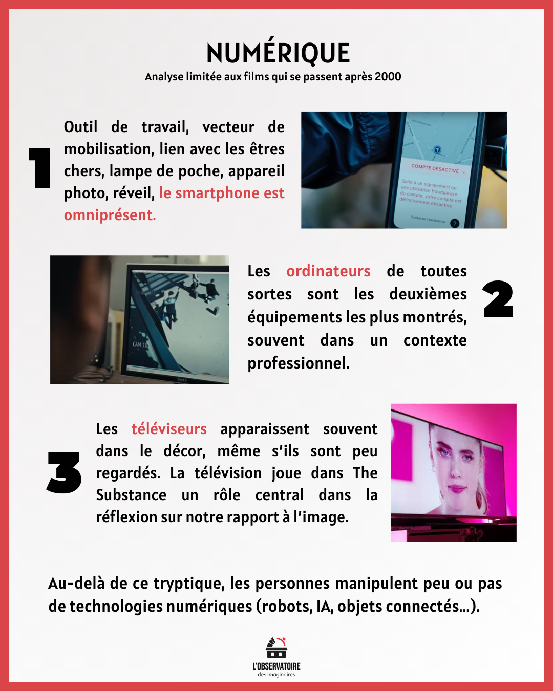 Parmi les outils numériques, le triptyque smartphone, ordinateur, TV est systématiquement observé dans les films dont l’époque ou le concept s’y prêtent.